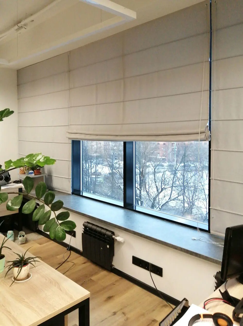 - Компактность. В отличие от классических портьер, римские занимают минимум места и оставляют свободным подоконник, не ограничивают доступа к нему.